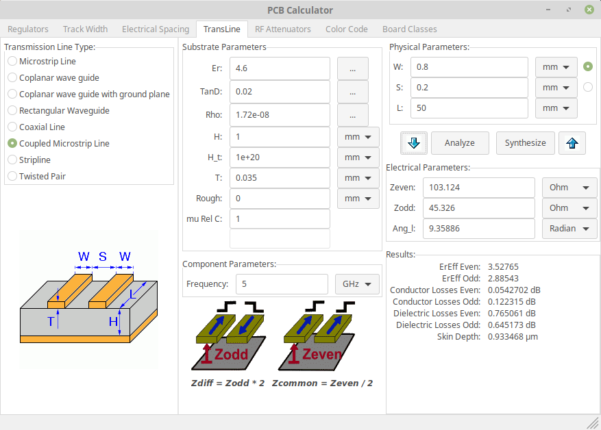 KiCad's PCB calculator screenshot on coupled microstrip line(click image to enlarge)