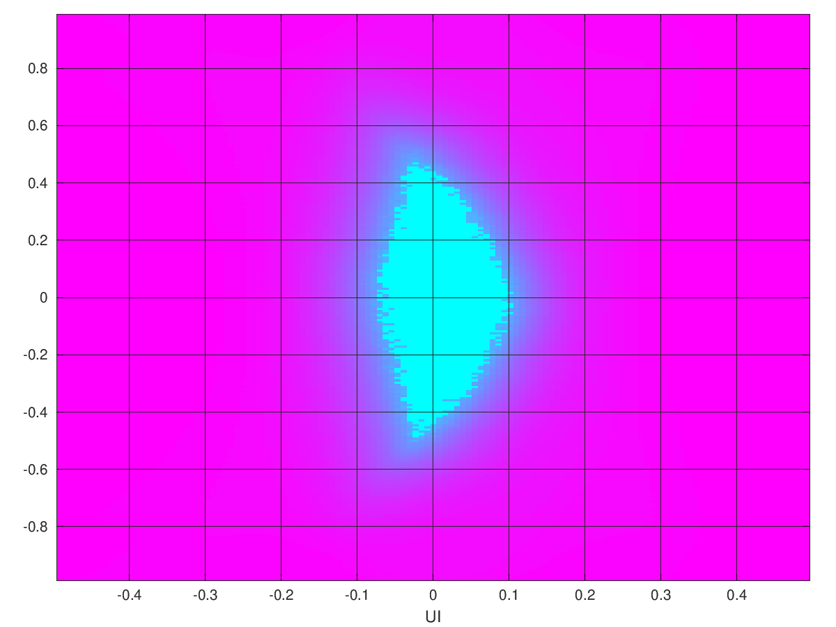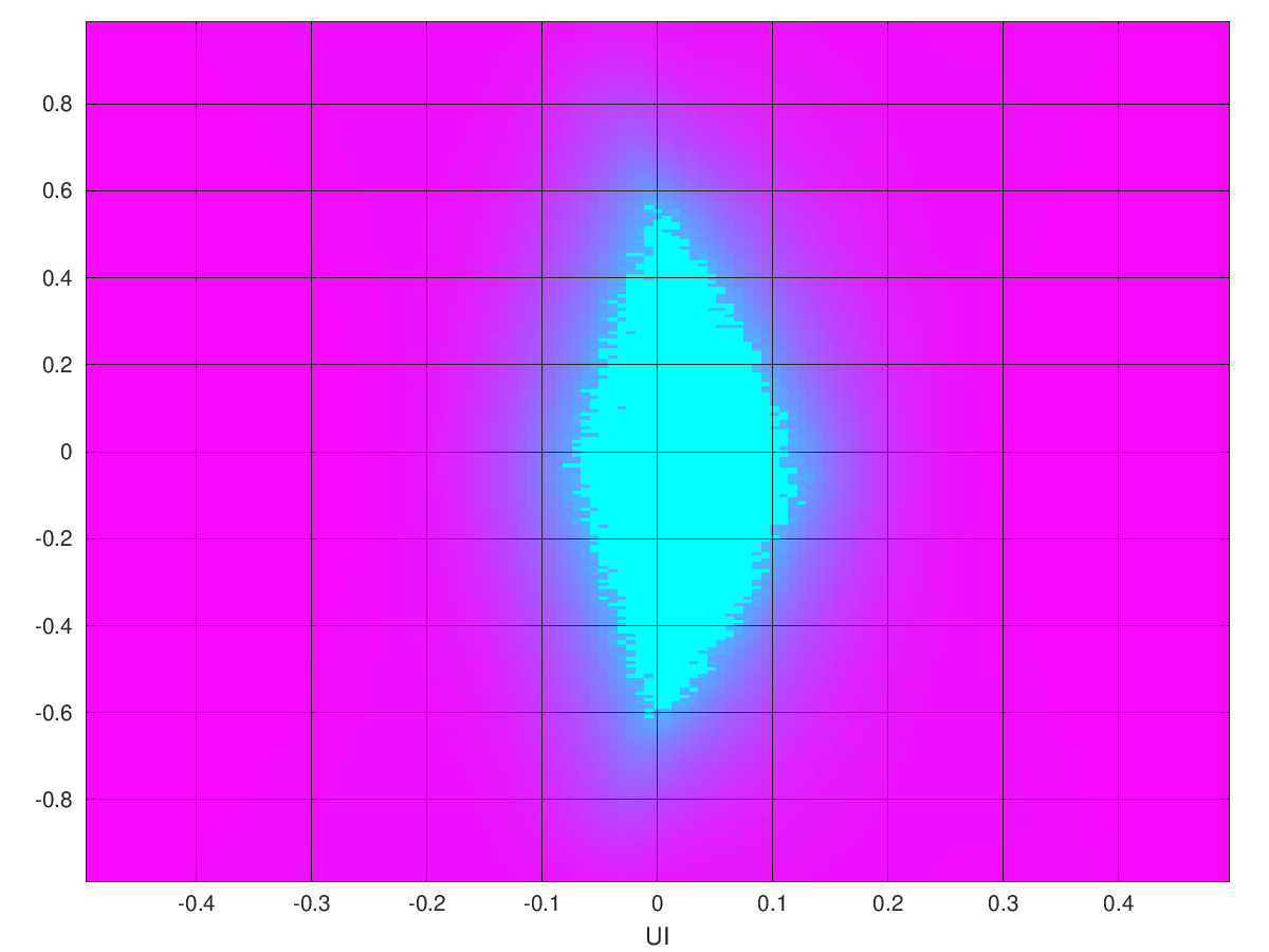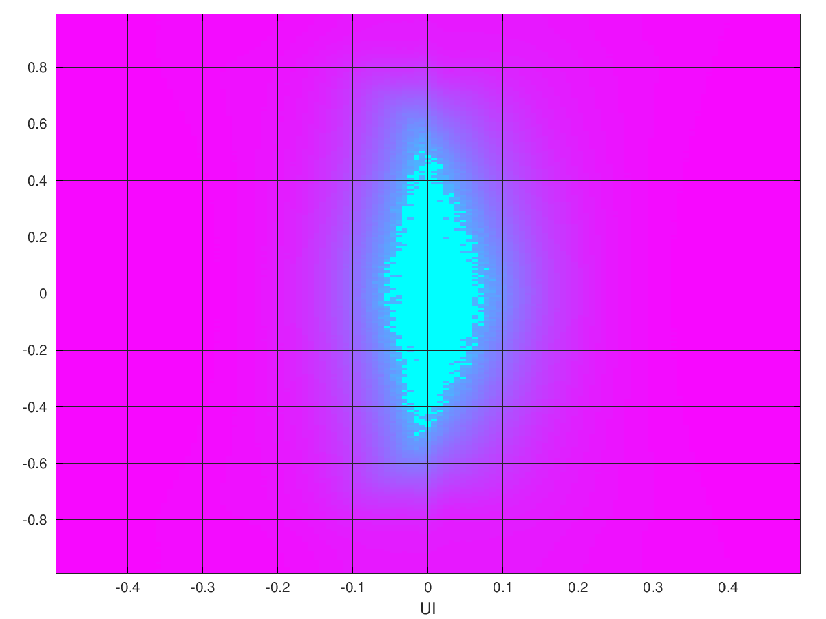 I’ve made a lot of statistical eyes scans for the said USB channel. This mechanism is made by Xilinx’ transceivers themselves, and is described in the respective user guides. In a nutshell, these scans show how the bit error rate is affected by moving the sampling time from the point that the CDR locks on, as well as adding a voltage offset to the detection threshold. The cyan-colored spot in the middle of the plots shows the region of zero bit errors, and hence it size displays the margins in time and voltage for retaining zero BER.
