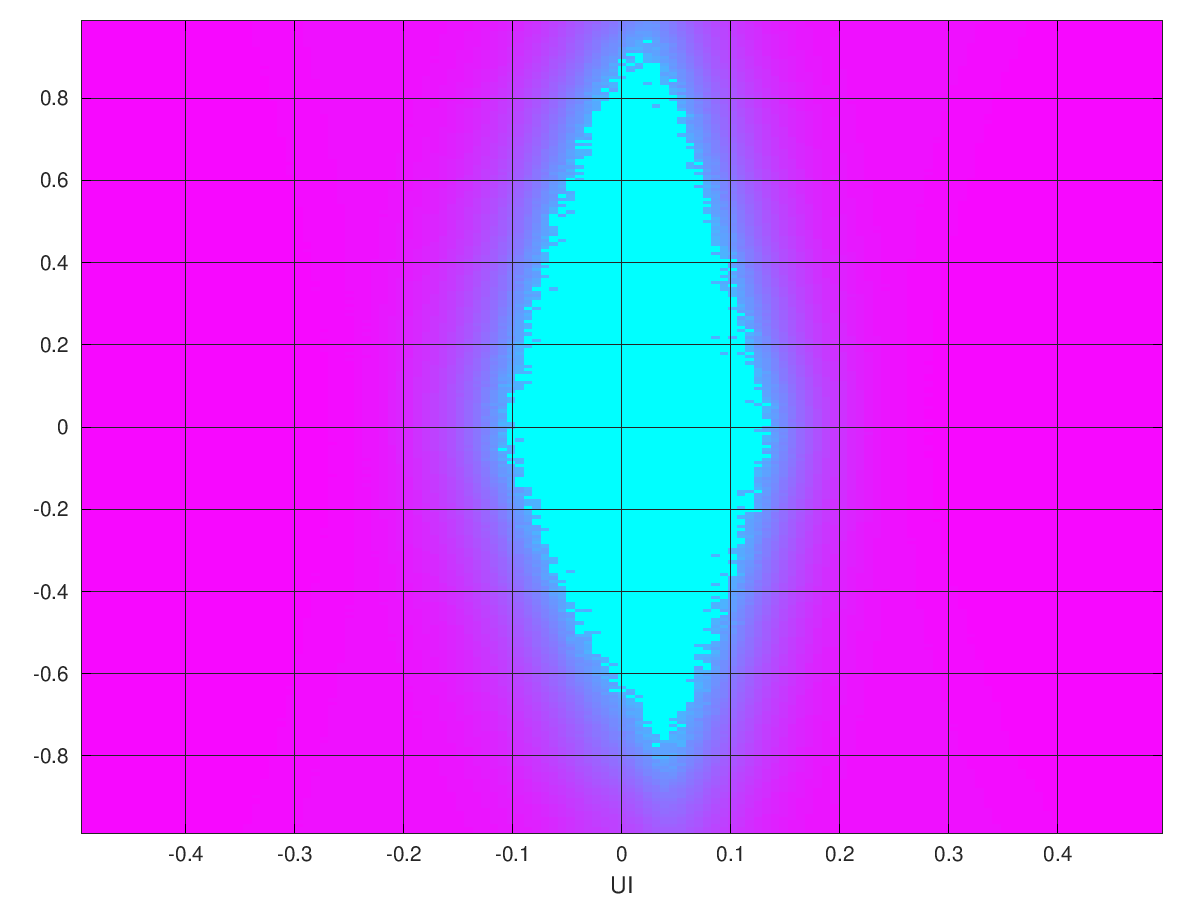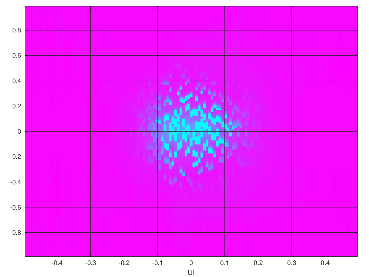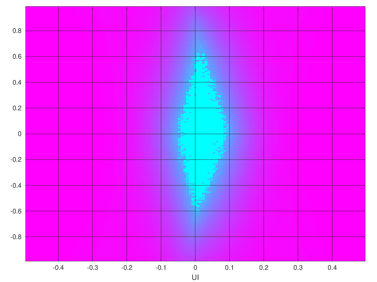 I’ve made a lot of statistical eyes scans for the said USB channel. This mechanism is made by Xilinx’ transceivers themselves, and is described in the respective user guides. In a nutshell, these scans show how the bit error rate is affected by moving the sampling time from the point that the CDR locks on, as well as adding a voltage offset to the detection threshold. The cyan-colored spot in the middle of the plots shows the region of zero bit errors, and hence it size displays the margins in time and voltage for retaining zero BER.