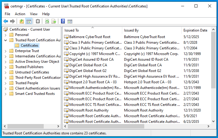 This baffled me for a while: I used certmgr to see if a Windows 10 machine had a root certificate that was needed to certify a certain digital signature, and it wasn’t listed. But then the signature was validated. And not only that, the root certificate was suddenly present in certmgr. Huh?