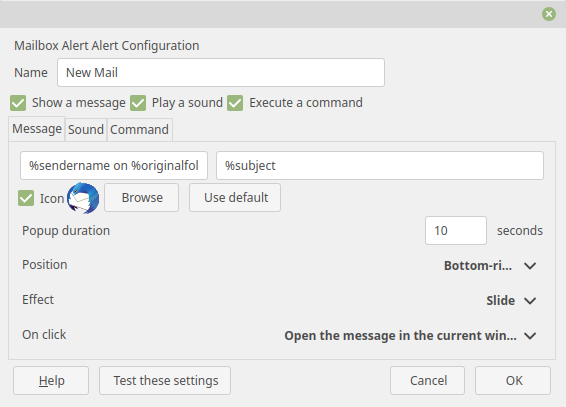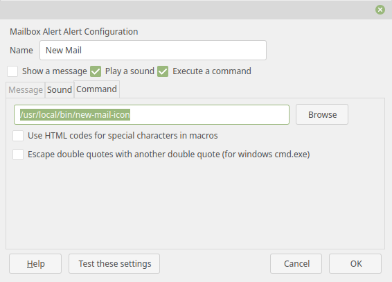 - Gnome Integration Options for calling a command on mail arrival. It was deprecated. So I went for Mailbox Alert, which allows adding specific actions: Sound, a message and/or command. With mail folder granularity, in fact.